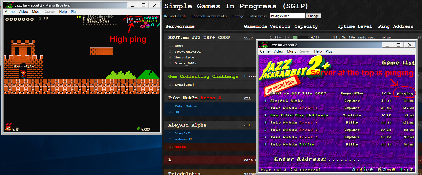 the bug is when someone opens the server list and the ping of the first server is over a certain value (something about 120 ms), the server will be shown as pinging. since I live far from EU, no one is able to join my server because of the high latency(and I can't join the server with the most number of players too) [Image1] https://imgur.com/qKQM5mq 148ms results in pinging which is actually not as shown in SGIP and the other instance of JJ2. [Image2] https://imgur.com/Z2ZQyfg Server Brut.me is not pinging anymore after its number in the list was changed. Notice that "Gem Collecting challenge" server is not pinging even though it is at the top. That's because the latency between me and that server is 15ms which is low. Temp solution: List a fake server and pin it on the top of the list (like what you do to advertise JJ2+ to vanilla players) -Does it happen in JJ2 (vanilla), JJ2+, or both? It happens in vanilla and JJ2+ v5.5-5.7 -Does it happen consistently or only sometimes? Consistently -Is the level in which it happens using scripting or is the server running a mutator? It happens in all cases. |