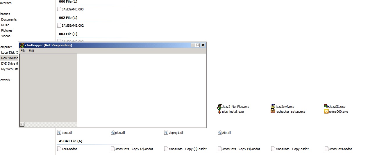 The only text file that was modified/created was the Jazz2.log file, but that seems to happen regardless of whether you have Chatlog=True (and the bug) or Chatlog=False (and no bug). |