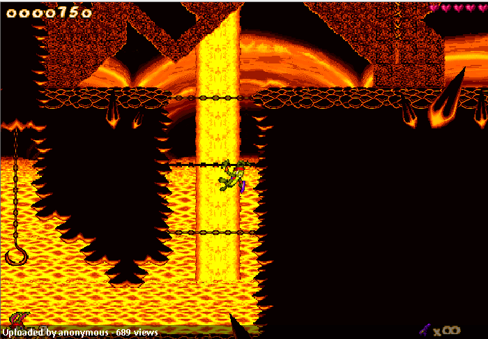 Lots of great tiles to use! the basic ground and slopes are here and they look really nice, having a 3d look on them. We got hooks, vines, polls, destruct blocks, tubes and a kick butt background. The background looks great and it really fits well. There’s no textured bacgkournd which was a let down but other then that, great job. there’s a little layer 3 stuff likes, chains, LOTS of lava, bubbles and weird shaped rocks. I would have liked some skulls or some of the other stuff from Damn. Still great work!