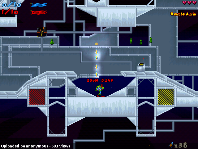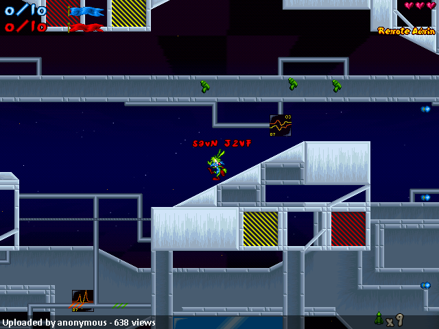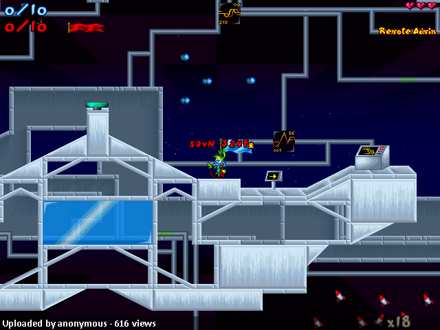 The level itself uses Blade’s excellent Space tileset. Blade’s work in this tileset is, as it always is, not extremely flashy. The tileset is not quite borderline cartoony, but does look nothing near realistic. This quasi-cartoon methodology definitely works for Blade in his tilesets, and it worked for CelL in this level. CelL, a true eyecandy master, is at his best here. The eyecandy, from the vairous pipes that wind throughout the level to the control panels, background, and everything, is well-done and without any major deficiencies. This, however, brings me to my first complaint. Either my eyes have not adjusted after a long time without reviewing or there is something odd about the scroll rate in this level. The way the background was moving in proportion to the sprite layer gave me a slight headache, but was not too much to bare. Turning on low detail helped this a bit, but it was not way too significant, and since I have no way of knowing whether it is just me or the level, I will not subtract for it. One thing about the eyecandy – and a minor one – did, however, bother me either way you slice it. The little animated microchips that read what looks like graphs and wavelengths changed in a very unnatural way. It looked like they were meant to stay as the same tile instead of be animated, and this bothered me. Plus, their attachment to the pipes seemed a bit artificial, and the surroundings just looked unfit to place that sort of tile there. Other than that, however, eyecandy was what everyone has came to expect from CelL.