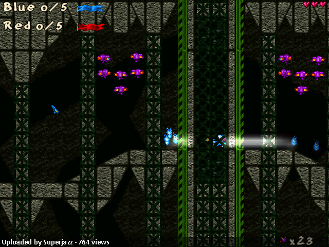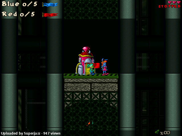 Xyzzy is a big level, although it’s not too hard to learn the layout (unless you’re staring at the nice industrial EC). It’s semi-symmetrical, so the opposing Zones are almost the same. There’s a toast and bounce PU for the Blue Zone and a toast and RF PU for the Red Zone and both teams have a Full NRG carrot on their shuriken/rhombus platforms. Fair enough. There are copters to make travelling through the three floors easier. That’s cool, also I like copters :P The bases are separated by a column on the center of the level and placed in the central parts, on the second floor of their respective Zones. It’s fairly easy to get to them. There is also a white warp at the very top of the level. It can warp you to the first floor of the Blue or Red Zone. Pretty interesting.