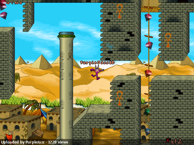Egypt is the 3rd tileset masterpiece by finish jazzer Agama. The whole thing resembles the ancient egypt, probably in the time of the new empire(or whatever:P). It has some neat things to create a basic egyptian villege, like buildings, a neat’o drawn brick ground. The buildings can be ‘decorated’ with things like plants hanging on the wall in small pots, old fashioned oil lamps, witch also have a lighted version in the night tileset, carpets before doors, windows where you can stand on the balconys and so on. The sky doesnt come as a textured background, but when i look at the layer 8 stuff Agama made for us instead, i totaly realize that a textured background is’nt necesary at all. The layer 8 stuff consists of a sky that already looks textured in the day version, and a beatutifull night sky filled with stars in the night version. It also has a perfectly drawn river(the Nile, no doubt) with the 3 pyramids in the distance, and palm trees at the sides. To decorate the plain bric ground, there are perfctly chaded brick tiles. There are also palm trees to stand on, big decorated pillars, and a incredile gaint statue of spaz, dressed up as a pharao. The poles where, very origenaly, made like those scepters you see pharaos holding on pictures. There are also tiles to create a ancient Egyptian temple, wich are maybe even more gorgeus looking then the ones i have been describing above. The ground here, constists of beautifully drawn brown bricks. There is all sorts of stuff to decorate walls, like the well known Egyptian heiroglyphics, perfectly drawn wall paintings of a rabbit in a charriot, rabbits with pharao-like hats, a few rabbits in a old-fashioned Egyptian canoe, and storks flying above a small pond. There are plants in small vases, and a statue of a black dog. To sum it up, this is one of the greatest tileset ever. Agama, alow me to worship the space you ocupy. And as for you guys, get this now.[This review has been edited by >CelL<]