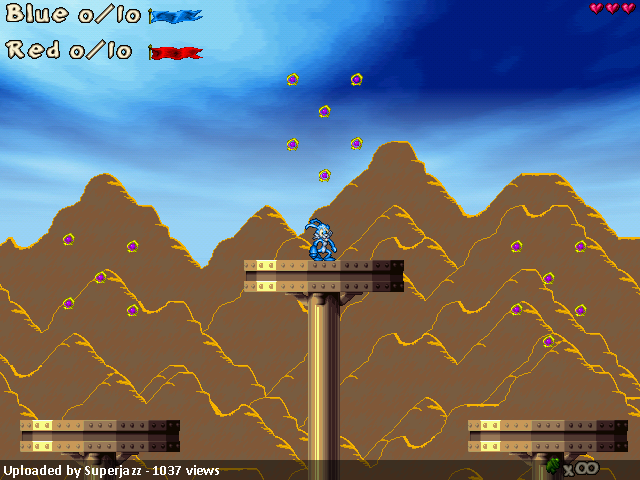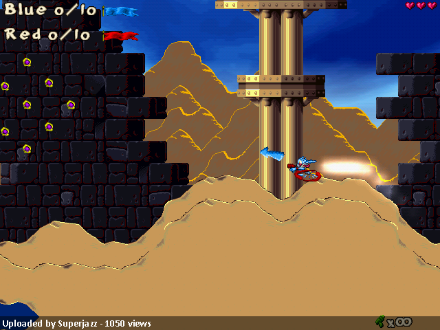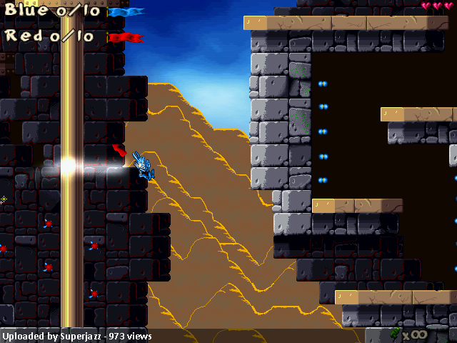 Whilst this isn’t a technical marvel in the visual department, it’s still among the best looking levels in recent years. The tileset usage has managed to convey the theme of the level without resorting to the typical eyecandy spam in order to effectively “rape” the tileset. Conceptually, this level features a fortified castle situated in the middle of the desert. I love the clean look that this level has – the tile usage is mostly very similar throughout the level, yet there is enough variety to keep things from getting too homogenous. It definitely has a more polished and professional feel than SJ’s other Deserto level, The Sun Fired Blanks. The .j2as file included provides a visual enhancement by altering the background colour to a “diamondus blue”, which is rather pleasant considering the lack of colour variety in the tileset, giving this level a more vibrant feel without detracting from the theme. It also matches the colour of the aqueducts in the level corners.
