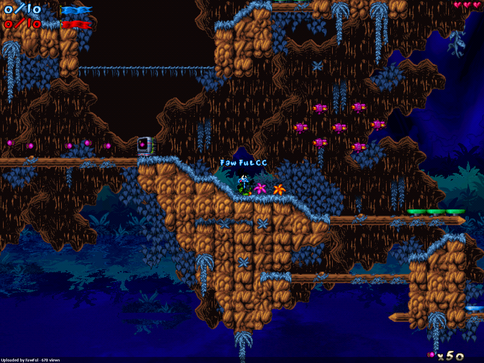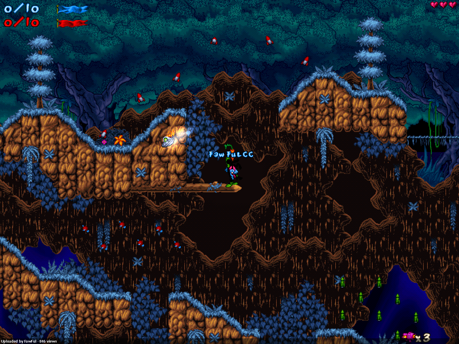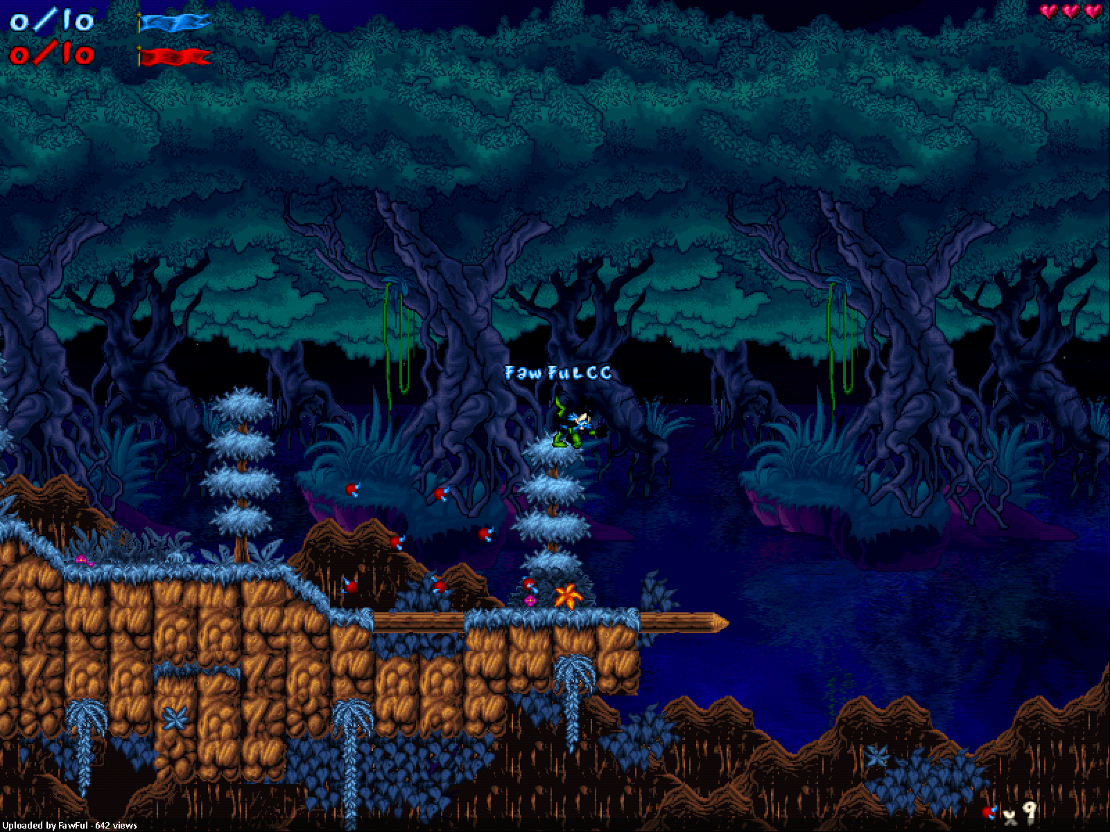 Okay! Here is a medium sized CTF level loaded with plenty of ammo for some great battles. It is very easy to navigate, but doesn't rely too much on flow. It has a "new" feel to it (if that makes any sense). The center of the level gets to be a bit of a maze, and it's easy to lose your way and fall off the level, fortunately being teleported back up. The level seems to rely entirely on camping, and is a paradise for campers like myself. The bases are right next to carrots and some ammo, making them ideal for sitting at. To counter this, there are a thousand ways into each base, making it hard to defend. Anyway, enough rambling. The background looks wonderful. GREAT JOB on the background. You'll really enjoy looking at the background when you see the way the trees reflect on the water. Anyway… Great level. It's like a 9.3 situation.