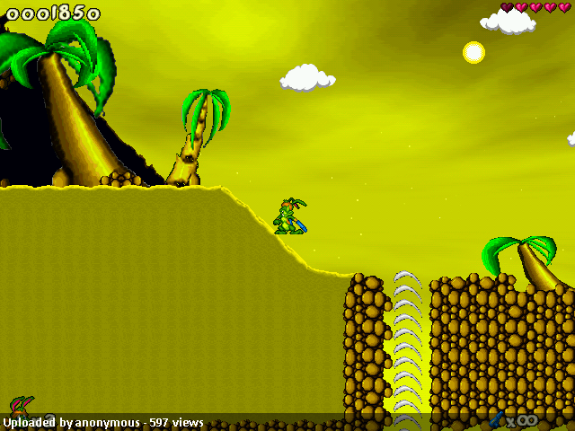 As said before, the 4 versions only differ in colors. In this case, Turtemple has a more yellowish tone, so it looks like a more sandy type of enviroment. What also helps is that the “lava” wall now looks more like orange sand. When changing colors in a palette, there’s a big change of screwing up the colors of enemies, some events (like springs) and of course Jazz and Spaz. Luckily the colors for them aren’t way off, just to a lighter shade. This is by far my favourite version out of the bunch.