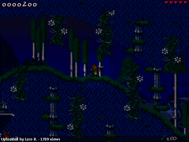 However, what I played was enjoyable enough to live on with the action and story while looking at the well made eyecandy. The tilesets used are the Jazz2 tileset remakes, which include enough for the eye. I’ve seen no obvious tilebugs (I’m no expert on this) and almost any wall is portrayed with tasty eyecandy. I did manage to stuck myself 2 times, once in a narrow edge at the castle, and once at the underwater tree in the woods. All levels make good use of light effects, not only to accompany backgrounds but also inside walls to create a nice cave atmosphere.