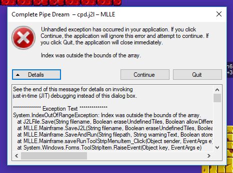 at J2LFile.Save(String filename, Boolean eraseUndefinedTiles, Boolean allowDifferentTilesetVersion, Boolean storeGivenFilename, Byte[] Data5) in C:\Users\Sam\Documents\Visual Studio 2015\Projects\MLLE\j2files.cs:line 1890