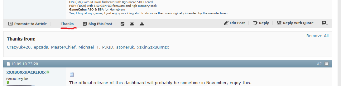 So the reputation feature has helped. I do like toni's Idea as well, it was I think what dermo was talking about in the first place, just a thanks button. It would also let you see what post specifically got a thanks, that way there would be less drama from some people, and in the long term still have the same advantages as the rep system.