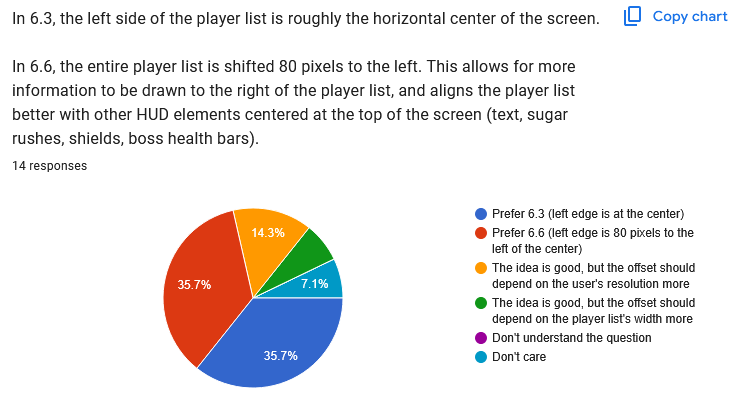 Individual question results: ![]() This is a pretty even split, but based on the next two questions, it seems we'll need more information drawn to the left of the player list, so it's going to make sense to move the list back to the right again. ![]() ![]() I'm grouping these two together because they're so related. Additionally, Faw wrote in the "Is there anything else" question at the end: Quote: