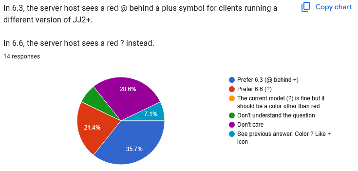 ![]() Clear 6.6 preference. ![]() Clear 6.6 preference. ![]() Okay, this one's hard. There's not an obvious answer here at all. I think you can make a case that a plurality of people doesn't want to see a + next to every player in servers where every player is running JJ2+. Whether to implement that with + or - symbols is a little murkier. It's been mentioned to me that the - icons aren't currently showing while people are still connecting to the server, out of fear that the information will be inaccurate, but I don't know for sure whether it's inaccurate at that stage or not. I'll have to experiment and see if that would make a difference here, because that might be the reason for some people's hesitance. ![]() Clear 6.3 preference. ![]() Clear 6.3 preference, at least within people who have opinions. This is being discussed in this thread. My worry is that people want to see this information because there's some unknown problem with 1.23 clients that they haven't reported, so if that's the case, I hope it does get reported. In the meantime, sure, they can be distinguished somehow. ![]() Clear 6.6 preference. ![]() Clear 6.6 preference. ![]() Clear 6.6 preference. Quote: