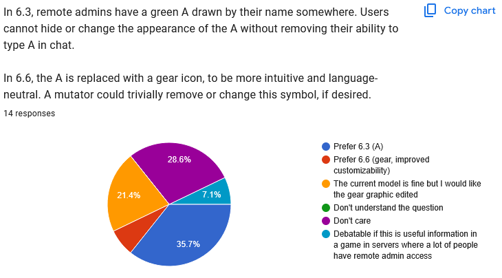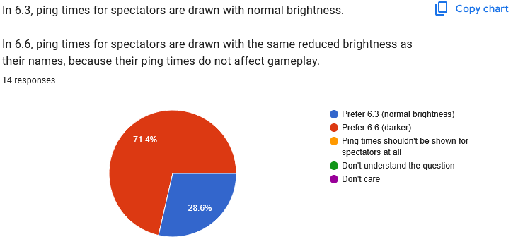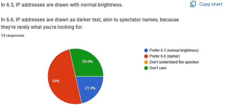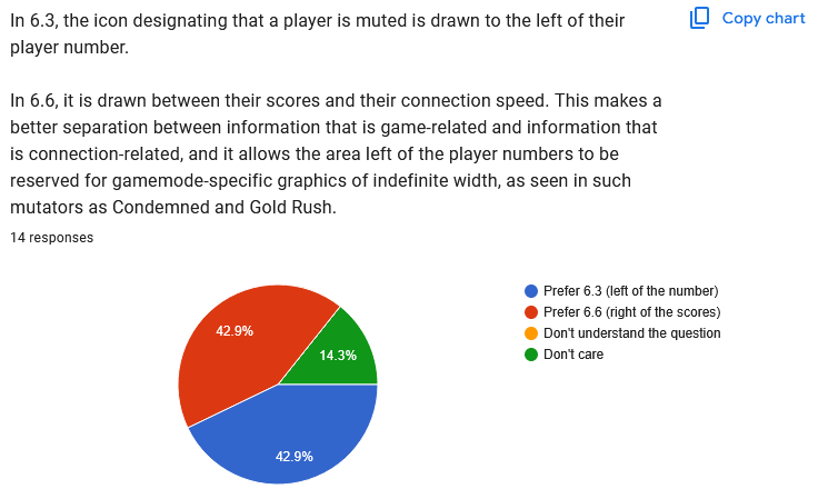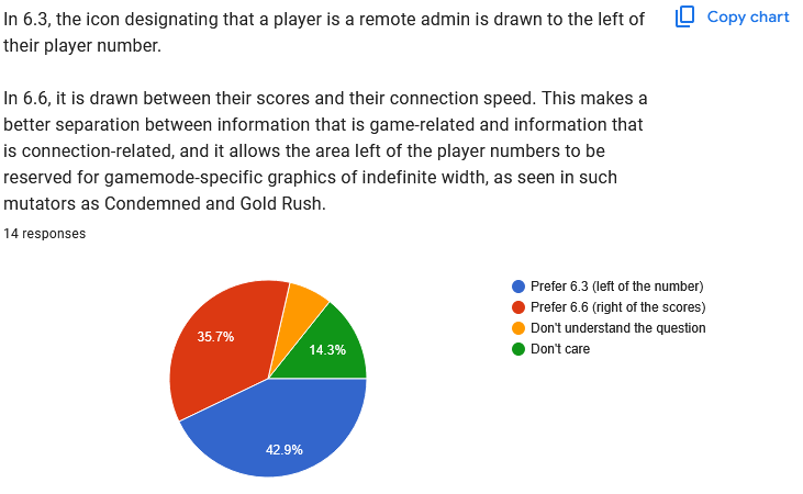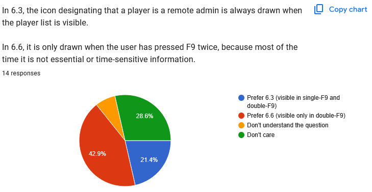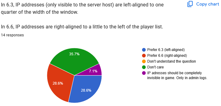 In summary, players prefer the Admin and Mute symbols to be on the left of the player list, not the right. Again, this means it is not practical to move the player list to the left, because that would leave very little room on the screen for gamemode information. ![]() Clear 6.6. preference. ![]() "Don't care" is the winner here. After making the above changes (moving the list back to the right, moving the icons back to the left), I'll see how much room there seems to be and how practical it is to allow two columns. I wonder if people just don't mute each other very much and that's what we're seeing here? ![]() Perfectly even split. Just going to stick with 6.6 because it's cleaner. ![]() Another even split. Again, after moving the list/mute/admin symbols around, I'll have to see which option makes more sense for IP addresses. Quote: