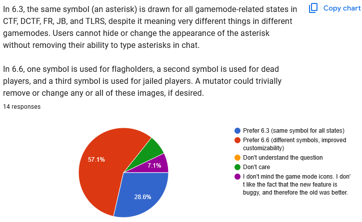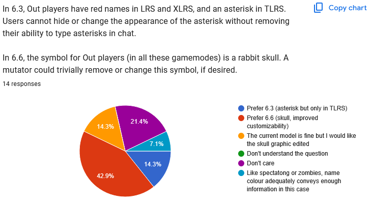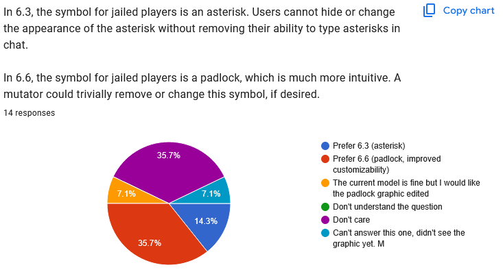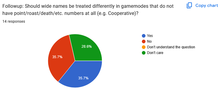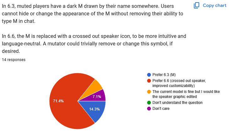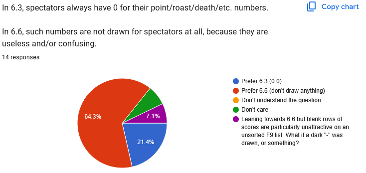 ![]() Well, this one is absolute chaos, huh? I have another idea that doesn't appear on the poll, maybe we'll try that, and then just keep experimenting with other ideas until we get to a point where people feel happy. This doesn't need to be solved in one update, we can keep trying. ![]() Yeah I dunno either! Free text responses: Quote: