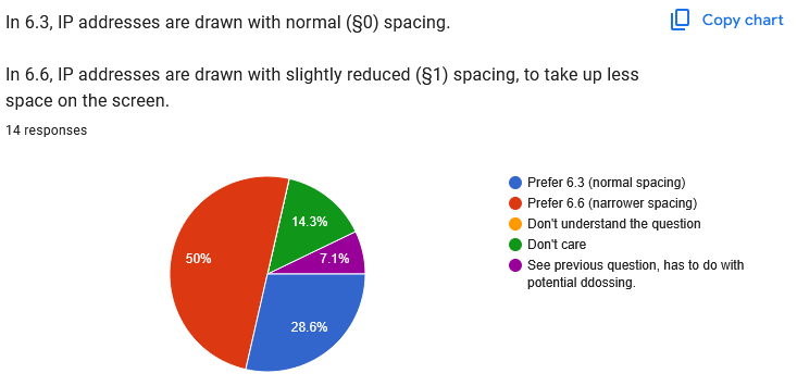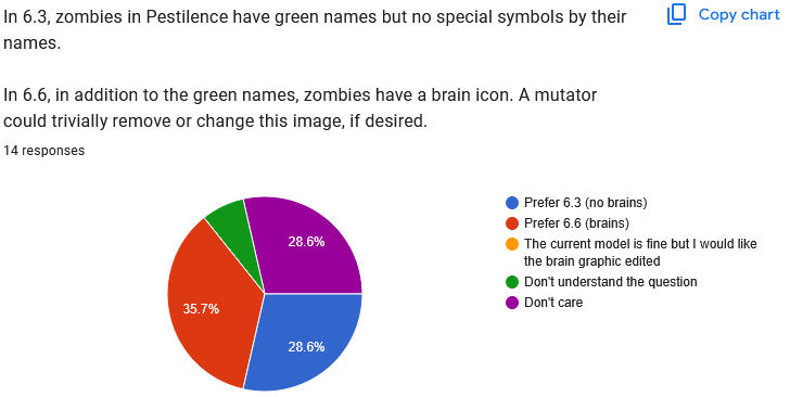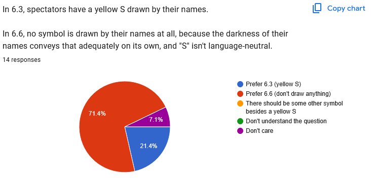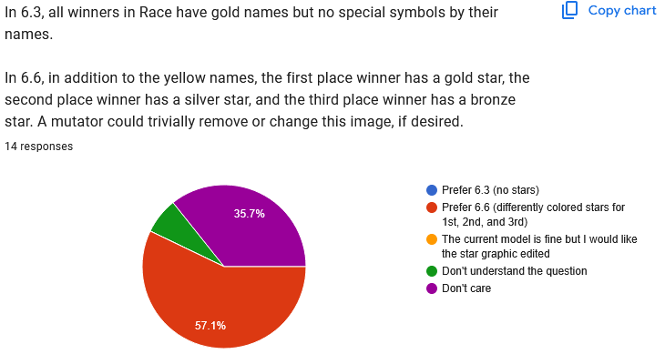 It's been a month, so this feels like a great time to take stock of people's votes and figure out how to go forwards from here. I'm including screenshots of the poll results because the pie charts are nice, but screenshots of text aren't accessible, so you can still view the results in spreadsheet form too.
