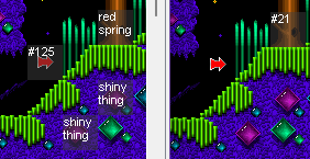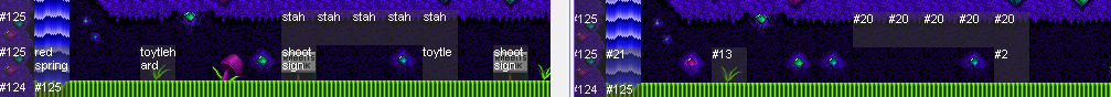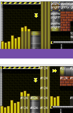 Miscellaneous: The bird uses totally different AI, it follows your movements precisely (but at a delay, and offset some distance upwards) instead of tracking you. ![]() The boss health bar is translucent gray (same effect as in Letni maybe?) instead of solid red. Pressing F8 in normal gameplay pauses the game and begins moving the camera around through nearby memory until you press any key. (Similar to pressing Esc in debug mode in G_MAIN.) Holding F9 pauses the game. There's an FPS counter in the bottom right in normal gameplay. It gets confused sometimes, especially when you're at flashing red health or changing weapons. One of the yellow shield gems is drawn in front of foreground tiles like Tubelectric tubes when the game is paused or showing a demo. All the level files define names for events and animations. (Different releases of JJ1 are inconsistent about this.) ORDER.0SC seems to have been corrupted on the disc somehow, so it's not in a usable state. "Instructions" from the main menu doesn't work. The text written to DOS when starting or quitting the game is different. An intro screen says "A BRUSSEE BLESZINSKI PRODUCTION", whereas 1.0's screen says "A GAME BY ARJAN BRUSSEE AND CLIFF BLESZINSKI" (and uses a smaller font). The main menu says "REVIEW COPY NOT FOR DISTRIBUTION." The shareware notice is moved to the splash screen instead. The images for episodes 3 and 4 are switched between 0.9 and 1.0. 1.0's "graphics detail" setting is not present in 0.9 at all. 0.9 uses different wording for the palette cycling speed in the main options menu, and doesn't include slow motion mode in the ingame options menu (although pressing T does work). MACRO.4 is identical to 1.0's, but MACRO.1 through MACRO.3 are different in 0.9. 0.9 unnecessarily includes BONUS2.000 through BONUS6.000, the tilesets for the bonus levels from episodes 2-6. (They're identical to 1.0's.) (The BLOCKS, SPRITES, BONUSMAP, and PANEL files are also all identical.) Level layouts: Diamondus 2 There are a lot of minor differences near the start, mostly having to do with removing events from 0.9 (maybe the game was running into memory issues?) ![]() In this little passage, 1.0 (right) removed two signs and added more background gems ![]() Just above and to the right of that, a lot of events got removed in 1.0 ![]() Another three events got removed here in 1.0 ![]() 1.0 added one more RF pickup here but also moved them two tiles up The treestump at 23,25 is in the foreground in 0.9 but the background in 1.0 ![]() Lots of the grass tiles in the big cave just before the end got changed (flatter in 0.9, more jagged in 1.0) ![]() The end signpost is raised up one tile in 1.0, presumably because there's a secret 1up above it, and this makes it much easier to reach the 1up and much less likely the player will shoot the signpost by accident. Tubelectric 1 ![]() The entrance to this tube (just to the right of the start area) was redesigned between 0.9 (top) and 1.0 (bottom) ![]() This extra life that you can get from the tube had not yet been added in 0.9, there's just wall here ![]() You're supposed to jump into this tube from below; in 1.0 the platform is higher up, to make the jump easier. Tubelectric 2 1.0 adds a hard/turbo spark at 26,2, 67,14, and 76,18. This is event #37, which is not defined in 0.9 and appears only in those three locations in 1.0. Curiously, event #32 is ALSO a hard/turbo spark. Event #32 has movement speed 3, same as the regular sparks, but the new #37 has movement speed 1 instead. The "floorgunhard" event (only appears at 66,3) is not properly configured in 0.9: it uses a spark animation while shooting, and Jazz can stand on top of it. Medivo 1 ![]() In five different spots (here are two of them), 0.9 (left) allows a partially masked tile next to some spikes, but 1.0 (right) replaces the partially masked tile with a fully masked tile, so that the player can't get stuck inside the cranny. In both versions, there are two hard/turbo vertical rapiers in the swinging platform sequence. 1.0 moves one of them from 103,16 to 93,14, so that it doesn't hurt players standing atop the checkpoint. ![]() The area above the end signpost is noticeably cleaner in 1.0 (right), even though none of this area is visible ingame. ![]() The area to the right of the checkpoint has ten more launcher pickups in 0.9, whereas 1.0 adds two carrots. Guardian ![]() There are five +15 toaster monitors on the top row in 0.9, and four on the bottom row in 1.0. |